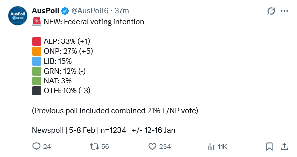 >Newspoll>The Coalition’s primary vote has plunged to 18 per cent, One Nation’s voter support has skyrocketed to 27 per cent, and Sussan Ley is the most unpopular major party leader in 23 yearshttps://archive.is/TJ9D5