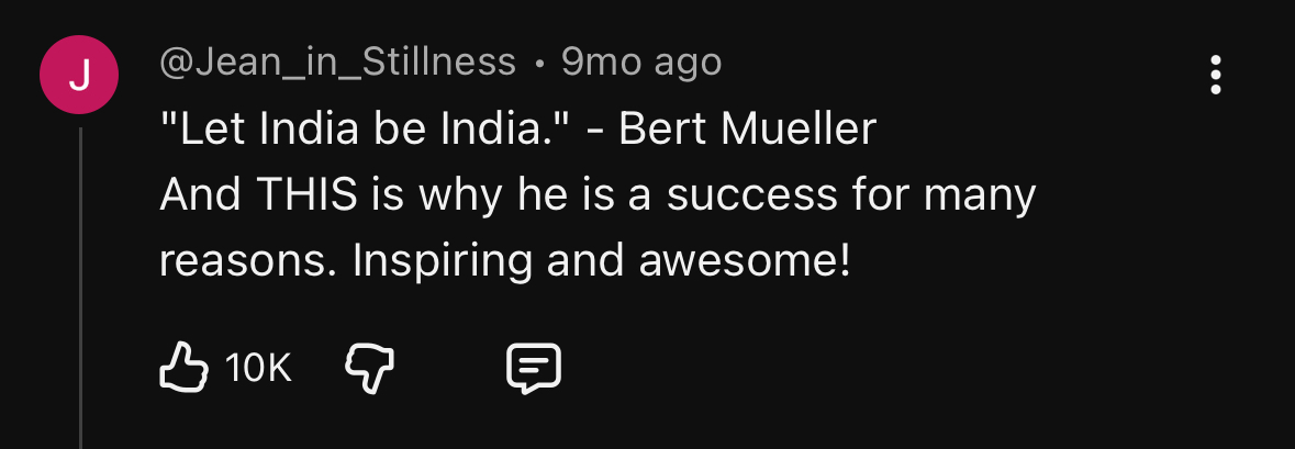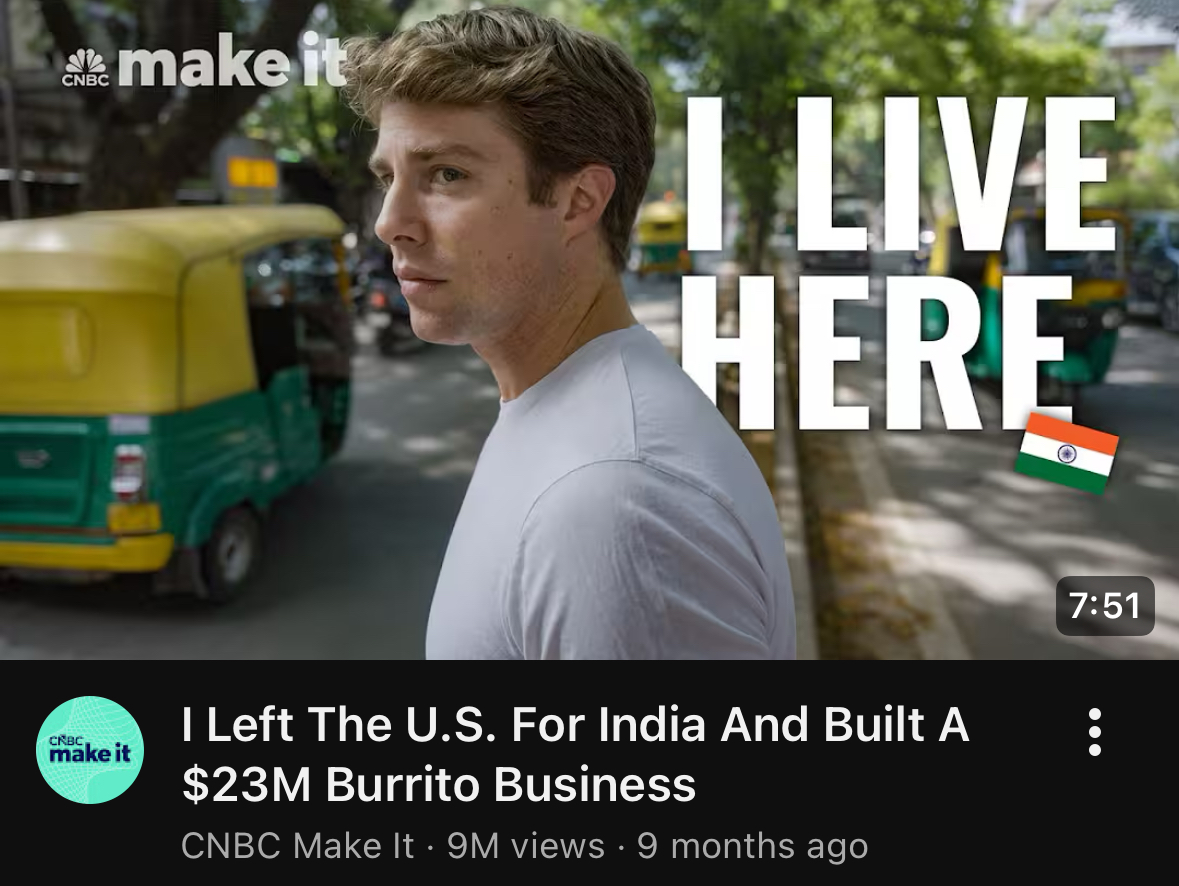 https://youtu.be/3enHvs7VaN8>Bert Mueller, an American, moved to Bengaluru, India, in 2011 and built a $23 million Mexican-inspired food business called California Burrito>Mueller started California Burrito when there was little competition in the Mexican food market in India, growing from one store to 103 stores in 12 years, with annual revenue of $23 million>He also mentions personal health challenges, such as contracting dengue and typhoid>He even tried growing avocados, though an elephant incident destroyed some trees>Mueller enjoys living in India, finding it a stretching and wonderful place. He describes his comfortable apartment and shares his frugal spending habits, noting he spends $150-$200 on groceries and up to $400 on dining out monthlyWould you risk culture shock, elephant attacks and typhoid for millions of dollars?Also, is India in the process of being mass-gentrified? Bert may be the first, but he is likely not going to be the last person to do this(I wonder what daily life for him is like)