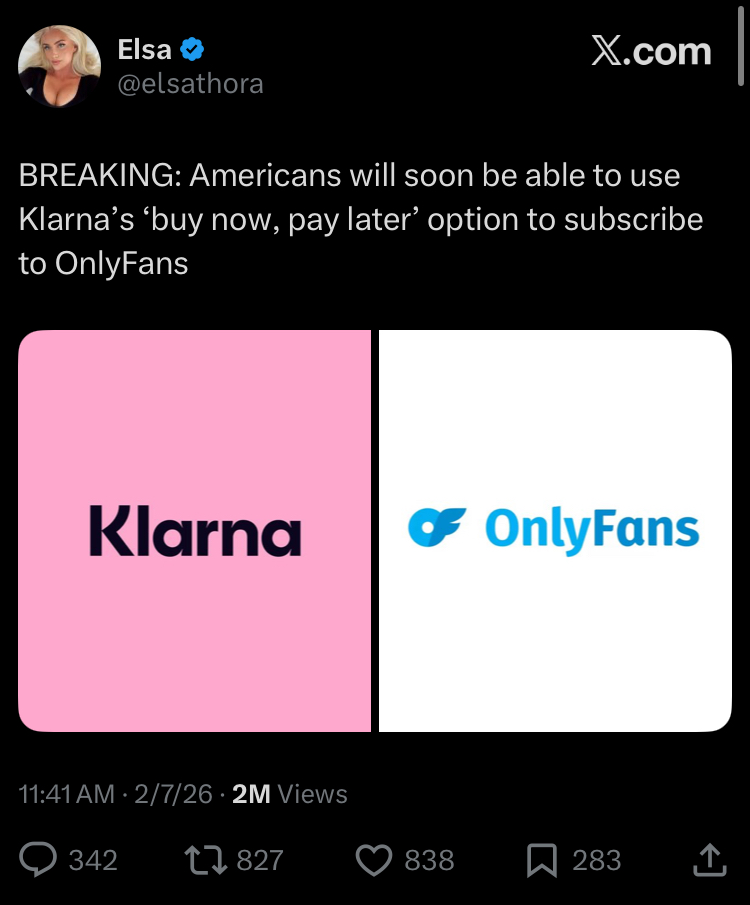 Even if this wasn't for porn the fact going into debt over 15 fucking dollars or whatever OnlyFans actually costs is terrifying.borrowing a couple hundred for car repairs or a TV I get but how the fuck are there enough americans so poor they don't even have 15$ just lying around to even consider this, in a healthy economy those guys would be so radioactive Klarna would just ban them.Seriously at this point you're not even debt slave material, you're the kind of guy who stacks 2$ payments one after the other and goes bankrupt while he still owes you a ton of money.Maybe it's just a pump and dump I guess, if Klarna is just some middleman and not a bank it'd make sense to get every retard to borrow and run before anyone figures out you're not getting it back.