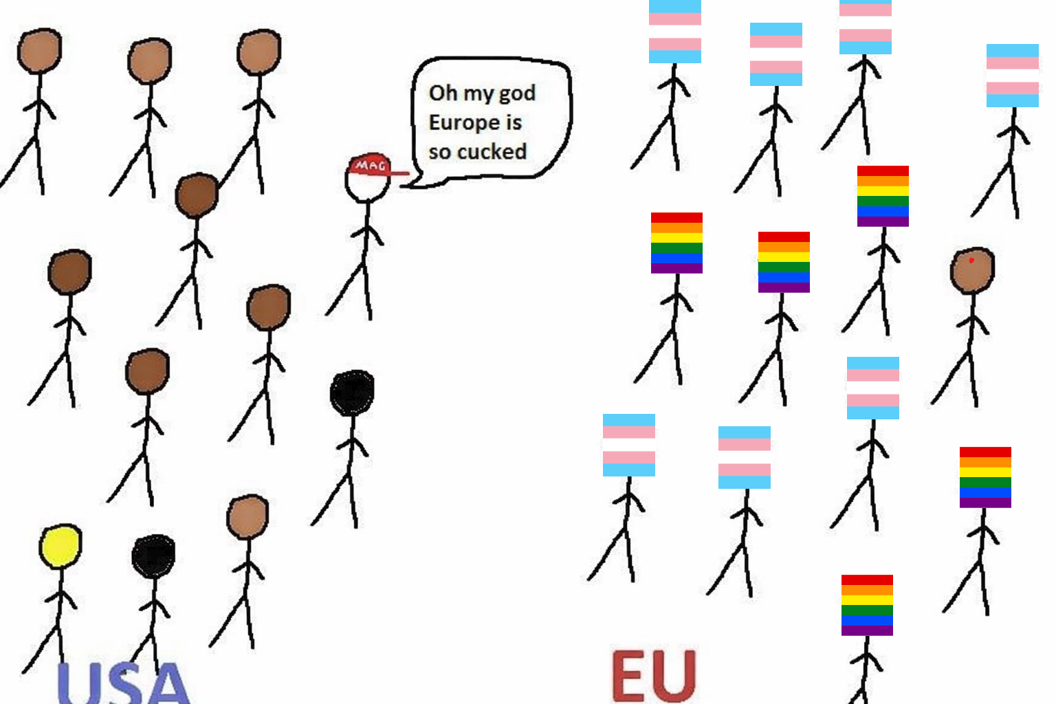 >>528003713Not realistic at all since the USA has way more people identifying as LGBT.- 9% in the USA- 6% in the EUIt's hard to calculate exactly but those are the averages using the best stas available.So you lose.Americans will always be stereotyped as fat homos.