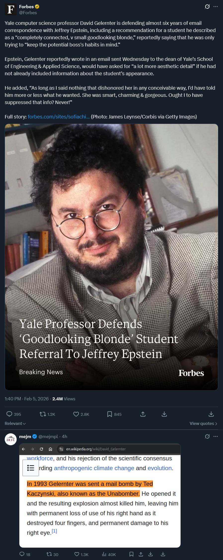 >>527995968>>527996758>>527998424>>528001091>>528003188David Gelernter blamed the jews for the downfall of American education in his book America-Lite. It was red alert at kike HQ. They needed to get him back on the reservation right away. So they blew his hand off and then used Epstein to subvert him by playing off his his natural jewish tendency for sexual harassment.
