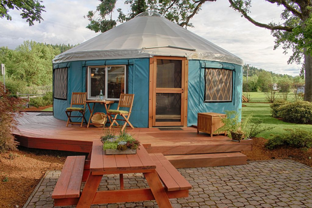 Yurts end up being pretty expensive unless you build the frame yourself. I would suggest building a cabin out of H4 treated pine sleepers that are 3m x 200mm x 50mm these are cheap and even without pain the H4 treatment makes them immune to rot for 20 years. The h4 treatment is safe enough to lick. Paint them and maintain them correctly and you get over a century of life.I realised while building raised garden beds in my backyard that for less than 3 grand AUD which is more like 1.8k USD I could build a 3m x 3m cabin, with a pitched roof strong enough for panels and a floor completely out of h4 pine sleepers.