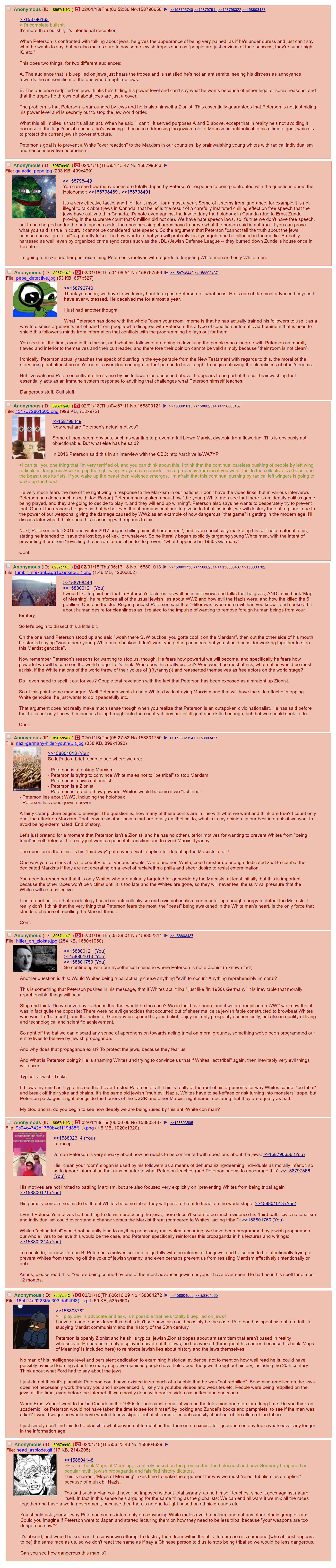 >>528000532> I think he's just a closet jew. Probably Jews in his pedigry, which is not uncommon. Many realized the cult they were born into and left it.>>528000625> He got hooked on drugsGood point. Satanists have different priorities. Maybe this could even be a potent discriminator for baby eater or not.>>528000700> most elaborate psyopsWhat does Peterson get out of that? He's suffering quite a bit under his condition.