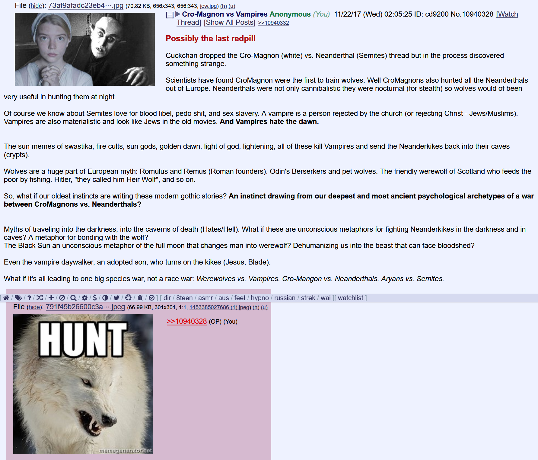 >>528000019This would explain why the glowniggers amplified that weird fucking wolfkin shit all over the normiesphere for like a year, but still sounds cringe AF. Easier to just say Jews cause natural disgust to non-jews, which is why they have to consistently push anti-hate and diversity narratives against the interests of their hosts.