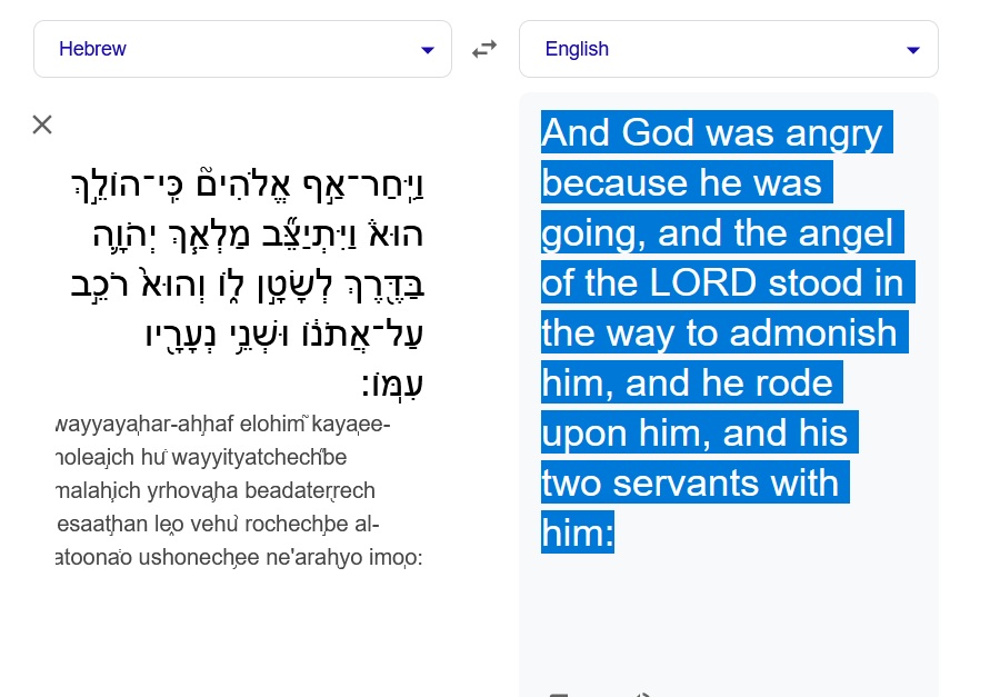 >>528003848Ok, heres the next verse. What about this?וַיִּֽחַר־אַ֣ף אֱלֹהִים֘ כִּֽי־הוֹלֵ֣ךְ הוּא֒ וַיִּתְיַצֵּ֞ב מַלְאַ֧ךְ יְהֹוָ֛ה בַּדֶּ֖רֶךְ לְשָׂטָ֣ן ל֑וֹ וְהוּא֙ רֹכֵ֣ב עַל־אֲתֹנ֔וֹ וּשְׁנֵ֥י נְעָרָ֖יו עִמּֽוֹ: