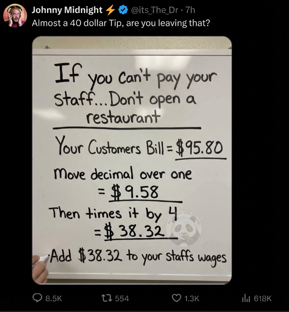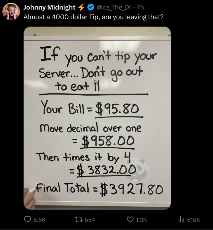 -- Tipping should not be a percentage that is fucking dumb. Serving a $100 dinner requires the same effort as a $500 dinner-- Tipping should be in rare cases when you really like the service, not a mandatory obligation-- Tipping is being used to get around mininum wage requirementsTipping culture needs to end. You should not be huslted into paying way more money. If they want to charge more, put it on the bill.