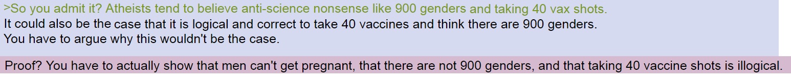 >>528004095Atheists worship>900 genders>men can get pregnant>take 40 vax shots for a non-lethal flu