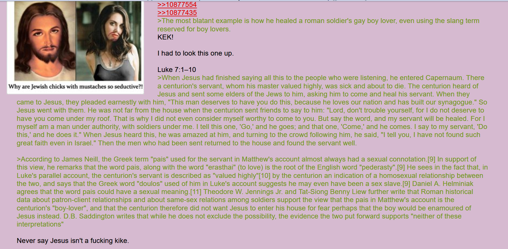 >>528011090>>528011252because if you keep going next you have josephus, hes easy to prove are interpolations, nothing prior to the 3rd century mentions jesus.so what then do you really have left? a bunch of "jews calling themselves christians existed, therefore christ existed", aka there is no evidence for his having existed. only evidence jews calling themselves christians existed. jesus' existsnce is based entirely on jews, known liars, who have told you they hate you and your own ancestors probably said never to trust them.