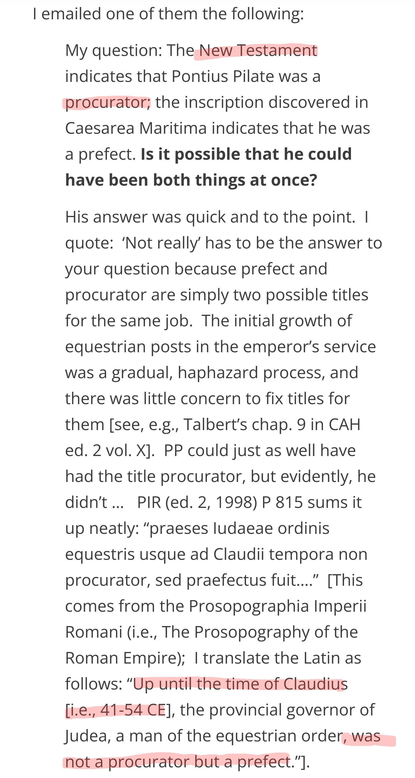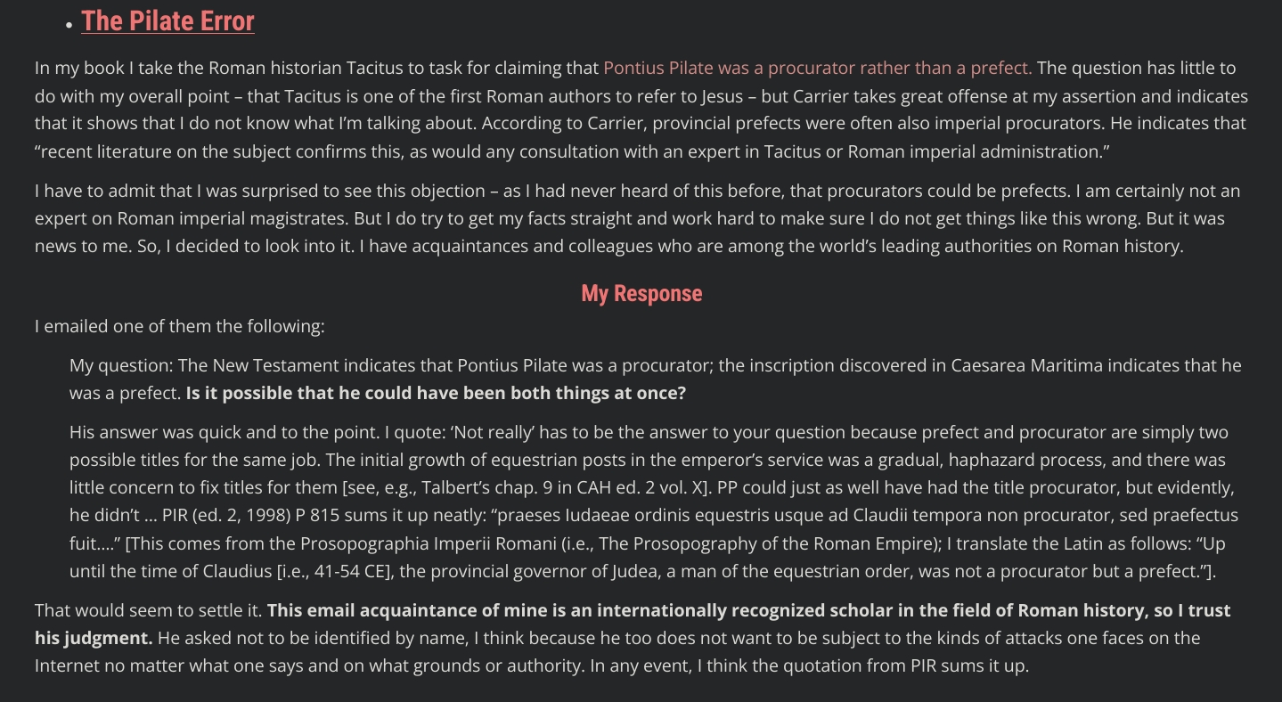>>528010668"In terms of official titulature, Tacitus’s error is straightforward: when Tacitus was writing in the early 2nd century AD the equestrian governors usually carried the official title “procurator.” Before the empeor Claudius, equestrian governors were generally officially called prefects."https://ehrmanblog.org/richard-carrier-a-fuller-reply-to-his-criticisms-beliefs-and-claims-about-jesus/