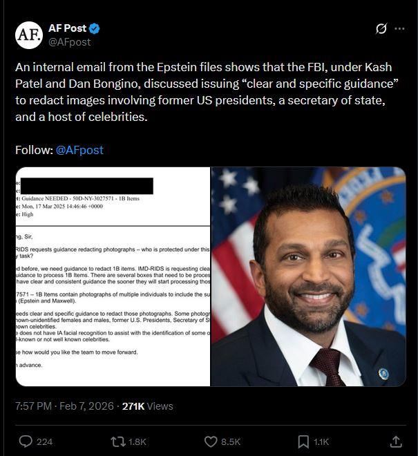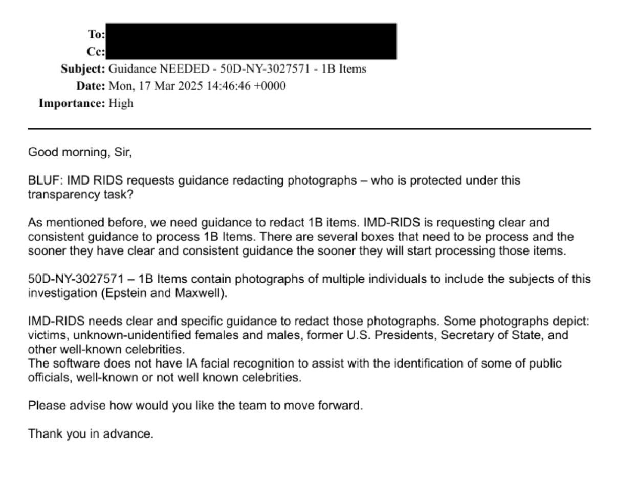 >>528003221>>528003239As always with this AF fag account. It's another person asking for guidance, not Kash Patel and Dan Bongino ordering specific redactions of said individuals.Considering that pictures of Trump and Bill Clinton are in the files, clearly they weren't redacted. You guys are fucking retards.