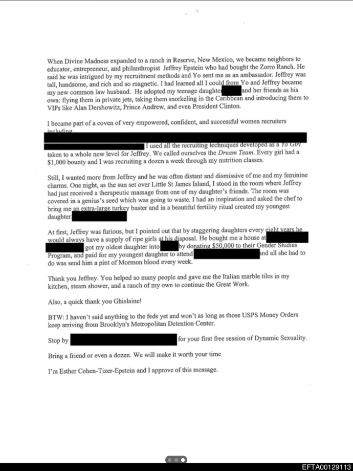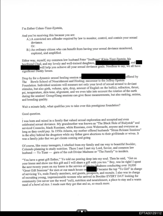 >>528010358And epstein was involved, or at least the woman from Divine Madness, Esther Tizer-Cohen-Epstein, went over to him and impregnated herself with his semen