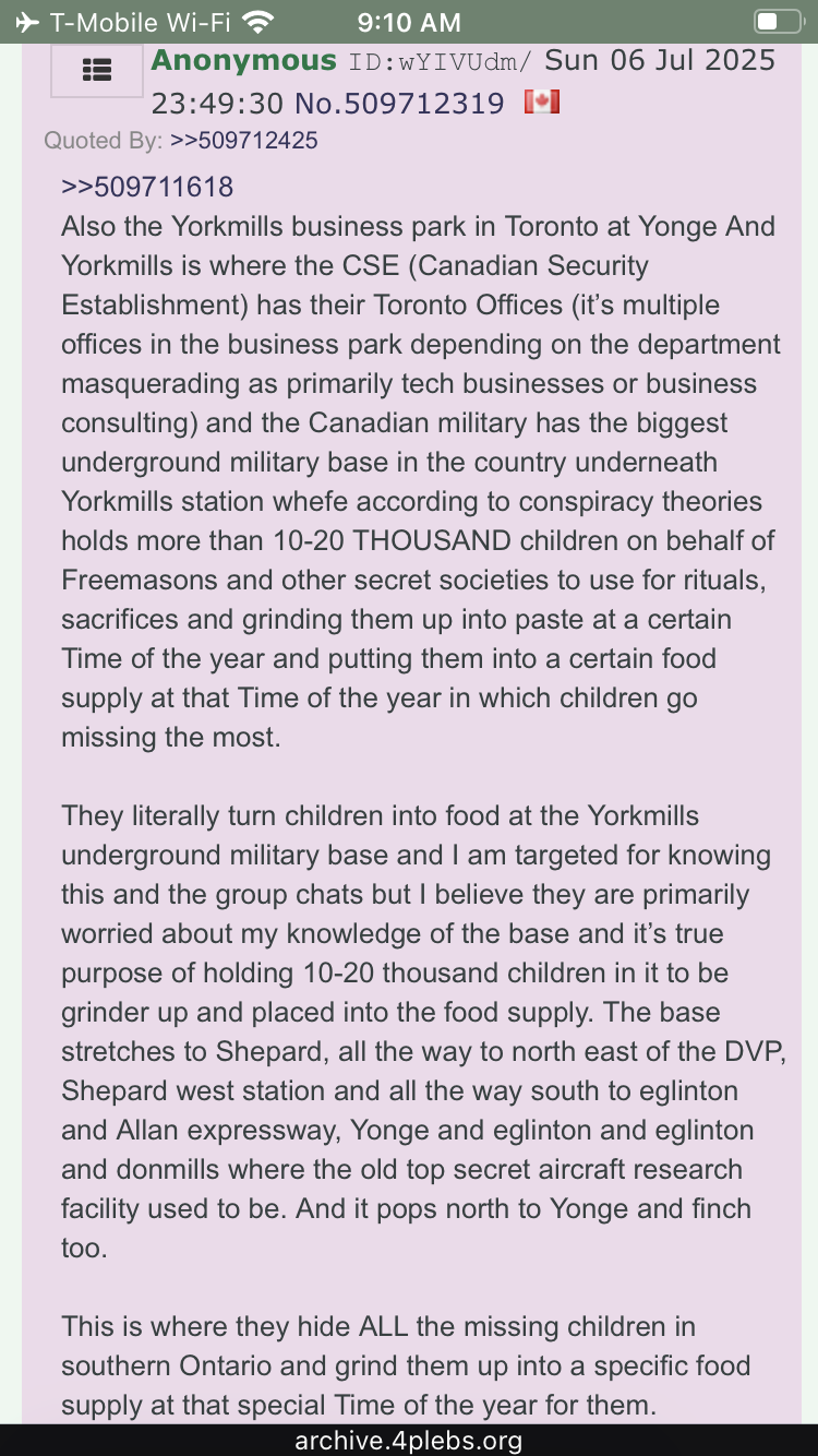 >>528011992Daily reminder that the #1 Job of the 5-eyes is to go after people that talk about intelligence agents running cults where they eat children. I’m literally being gang stalked by Canadian intelligence because there is a deep underground military base underneath Yorkmills station in Toronto that connects to the North American wide underground highway system where they grind up the bodies of abused children and distribute the paste via the underground highway system which connects bases in Canada, America and Mexico.