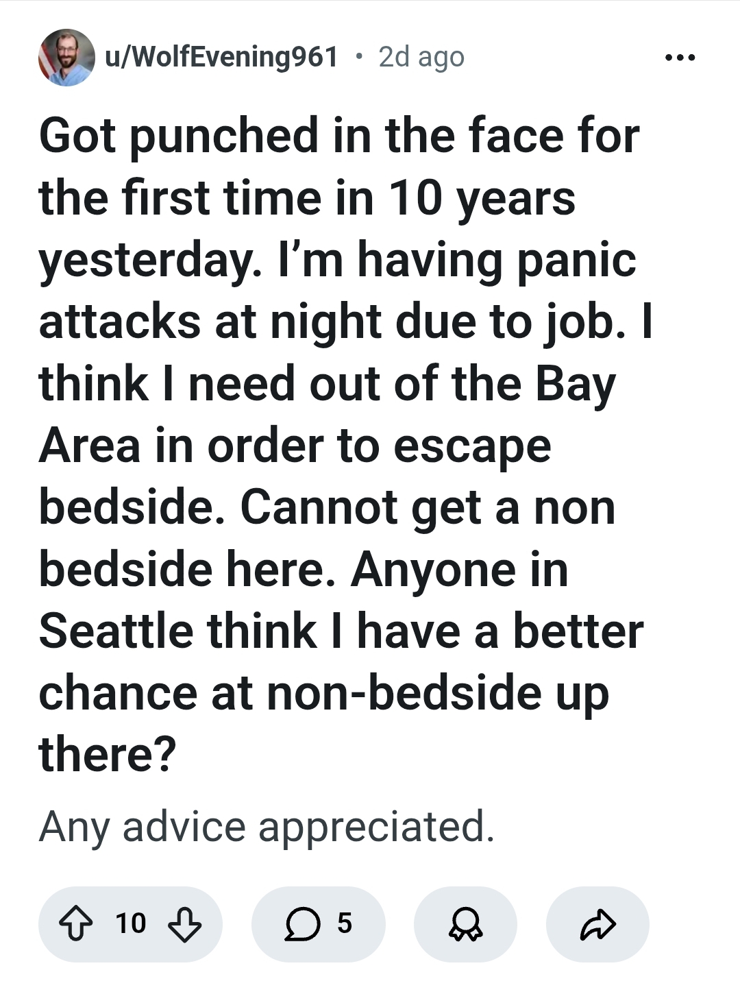 >>528013292He wants a nursing job that doesn't involve actual nursing. Evidently, sitting at the front desk for eight hours being unhelpful and largely useless is a body of work unto itself.