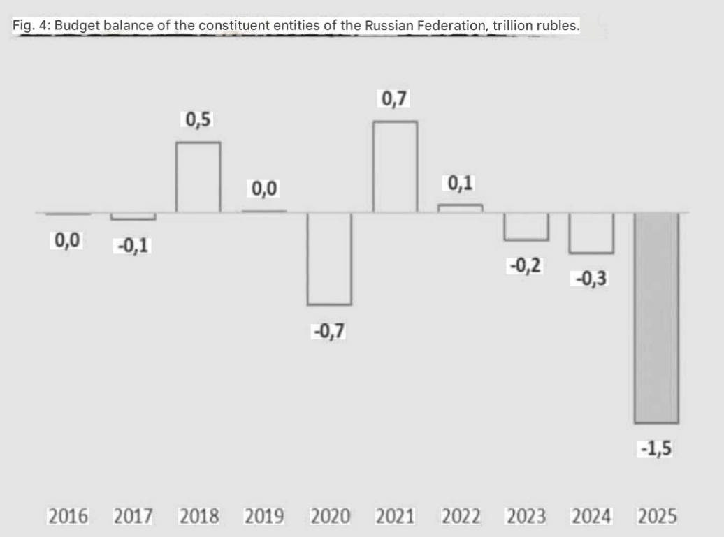>"The picture is sad." A record-breaking “hole” of 1.5 trillion rubles has formed in the budgets of Russian regions>Russian regions ended 2025 with a total local budget deficit of 1.538 trillion rubles, the Russian Ministry of Finance reported. Compared to last year, the “hole” in the budgets of the subjects increased 5 times, compared to 2023 - almost 8 times, and its final size became unprecedented in 20 years of available statistics. The regions set the previous record during the pandemic crisis (677 billion rubles in 2020), but it was doubled.>At the end of the year, revenues to the regions of the key income tax decreased by 8.5%, to 5.278 trillion rubles, and total revenues increased only by 4.8%, to 25.87 trillion rubles. At the same time, expenses increased by 10% and reached 27.408 trillion rubles.>“The picture is very sad,” states economist Natalya Zubarevich. Detailed data is still available for 9 months of last year, and they show that 52 entities had a budget deficit. “The most difficult situation is in the Kemerovo and Vologda regions, where the deficit is 25% (of their own income), in the Arkhangelsk, Murmansk, Tyumen regions (20-22%), in the Irkutsk region and Komi (17-18%),” lists Zubarevich.