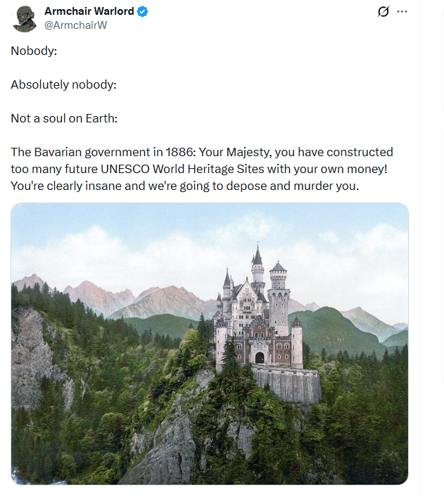 >>528014184It's actually true though. Other than being gay, the guy who built that castle bankrupted himself on it and then borrowed from family and others so he could complete it and two others. He was going to fire his entire cabinet if they did not beg other foreign royals for loans, so they turned on him and said he's insane. I like the castle, it's admirable he did not spend tax money on it and bankrupted himself instead, but it's not really untrue.