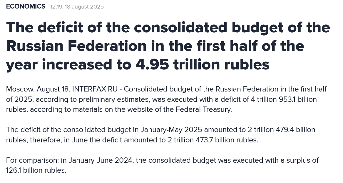 >“Putin will push the Central Bank to print money.” The Russian budget deficit reached almost 2 trillion rubles in a month>The Russian federal budget in January was reduced to a deficit of 1.718 trillion rubles, which is almost half of the plan for the whole year, according to the Ministry of Finance data published on Friday. Over the month, the treasury received 2.362 trillion rubles in revenue - 11.6% less than a year earlier. Oil and gas revenues fell by 50% and became the lowest in 5 years - 393 billion rubles.>Collections of non-resource taxes increased by 4.5%, to 1.969 trillion rubles. VAT receipts jumped by almost a quarter, to 1.13 trillion rubles, after its increase to 22%. However, this growth turned out to be powerless to compensate for the failure of raw materials revenues, even despite the fact that the Ministry of Finance began to slowly reduce expenses - by 1.4%, to 4.08 trillion rubles.>As a result, the “hole” in the treasury was 17% higher than the January 2025 deficit. And the accumulated total since the beginning of the war has resulted in a deficit of 17.4 trillion rubles in the Russian Federation budget, follows from the Ministry of Finance data.>“The high values of the deficit at the beginning of the year are mainly due to advanced financing of expenses,” explains the Ministry of Finance. This year he planned to reduce the size of the budget “hole” from 5.7 trillion rubles last year to 3.8 trillion.>However, a collapse in Russian oil prices to $40 and problems with its export to India could lead to a deficit 2-2.5 times higher than planned, a source close to the government told Reuters. According to him, closed calculations showed that the hole in the treasury could reach a record 10 trillion rubles, or 4.4% of GDP.>Due to problems with the budget, the Ministry of Finance proposed to freeze the funding of all government projects at the expense of the National Welfare Fund (NWF), and may also “put under the knife” civil articles.