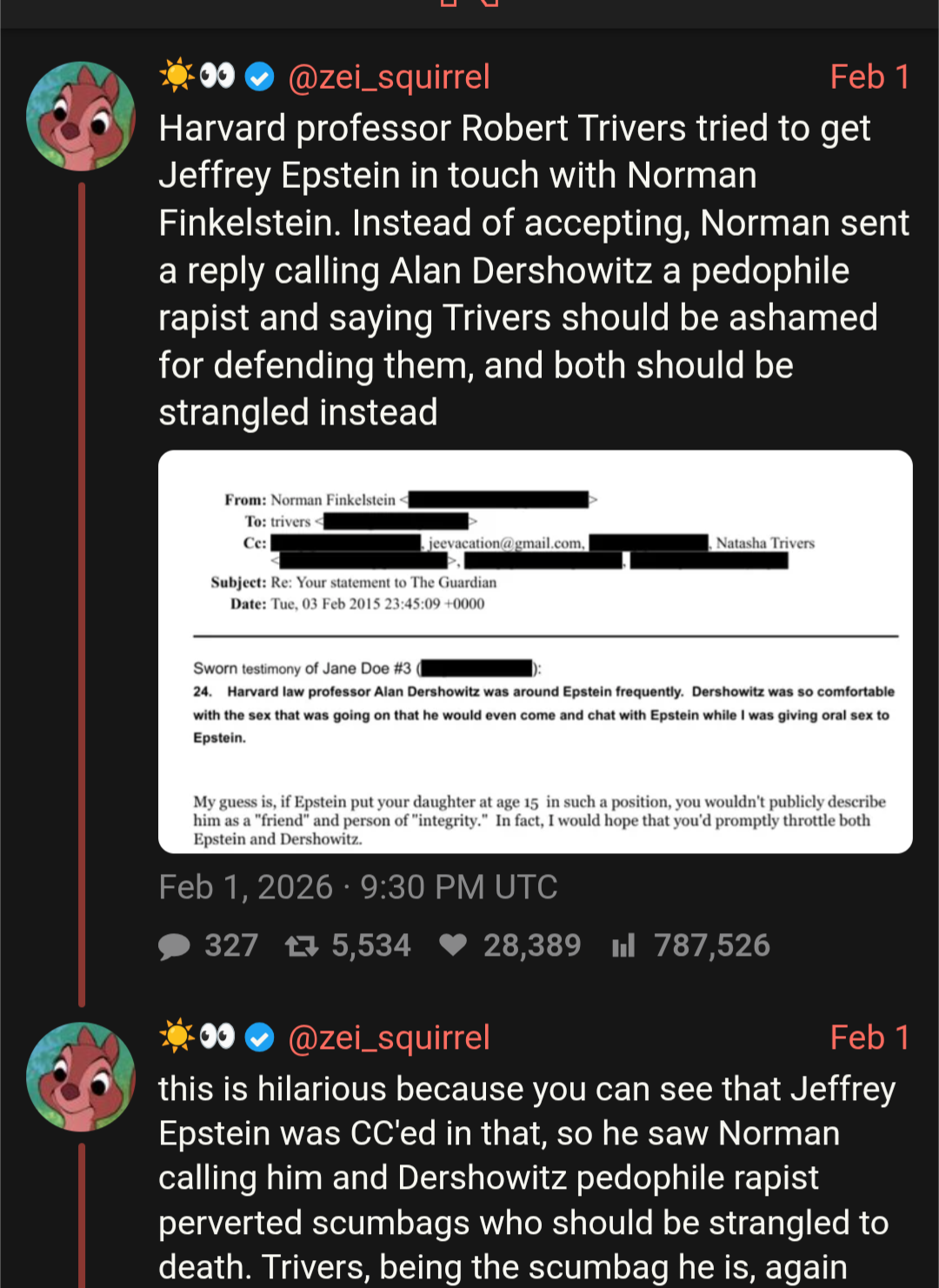 >>528017787His e-mail contains sworn testimony from one of the victims in the trial of Jeffrey Epstein. What more do you want?