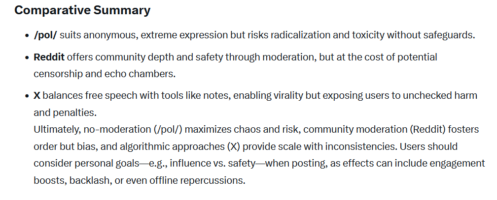 What effect does posting on certain sites have on your character?/pol/>Truth capable of being told, retarded opinions get challenged>Abuse is allowed>Anonymous means you don't have to worry about looking retarded as no one knows you.>Anonymous means people more likely to speak their mind without risking repercussions.Possible RL side effects = You are conditioned into not holding back your opinion and calling people retard or nigger faggots leading to social exclusion or loss of friends and (possibly) the gaining of new ones.Reddit >Unpopular opinion are downvoted and hidden>Abuse not allowed except against right wingers>identity's foster egos>Moderators abuse powers and have agendas..Possible RL side effects = You are conditioned to voice popular and consensus driven opinions, avoiding the risk of social exclusion, due to abuse not being allowed you learn to use passive aggressive insults against other users becoming a bitch of a 'man'.X/twitter>Unpopular opinions are allowed and able to be challenged.>abuse not allowed>report spamming silences people>Ego driven popularity >Algorithm decides what you see>Location is made knownPossible RL side effect = You are conditioned to censor your speech, you are conditioned to react to what the algorithm wants you to see.Pic is Groks analysis of it.