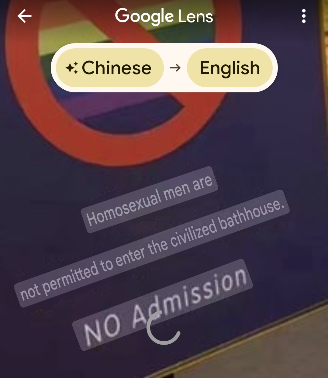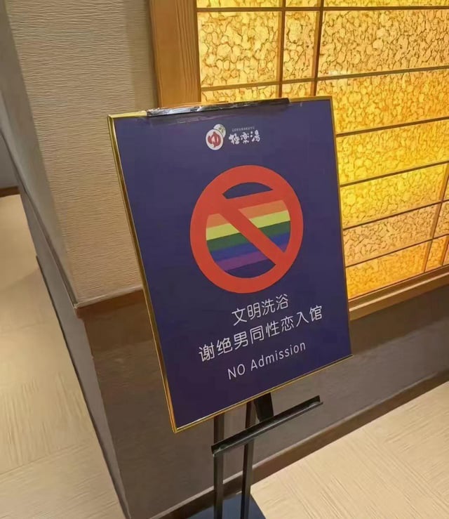 >>528019365Here’s what the text on the sign says (Chinese plus the English line) 文明洗浴“Bathe civilly” or “Please behave properly while bathing.”谢绝男同性恋入馆“Gay men are not allowed to enter” or “No admission for male homosexuals.”NO Admission“No admission” or “Entry not allowed.”Also, the symbol shows a rainbow flag with a prohibition sign, reinforcing the “no entry” message