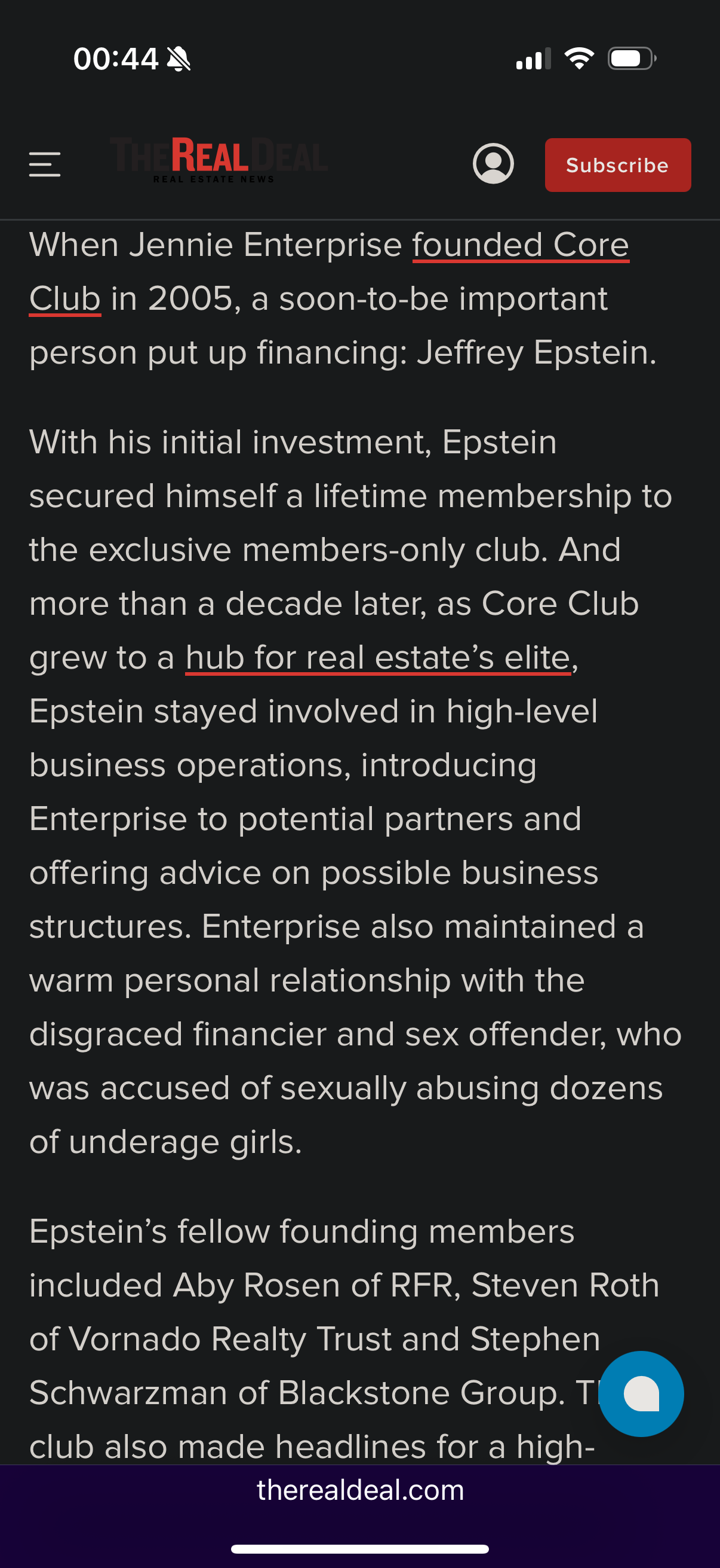 here’s crosscock or whatever the fuck her company is called, link is here but you’ll have to bypass a paywall with brave or something to read like I did. https://therealdeal.com/new-york/2026/02/06/how-jeffrey-epstein-became-core-clubs-guardian-angel/
