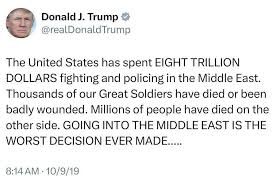 yeah america is running a lotof shit, if yu try to pollute their skynet b ysyaing shit like you re gonna bomb the whtie house they ban you for violating the law (on this pedo website)if u say shit not so good about trump in a thread you ll probably slide, speaking of which>The United States has spent EIGHT TRILLION DOLLARS fighting and policing the Middle East. Thousands of our Great Soldiers have died or been badly wounded. Millions of people have died on the other side. GOING IN THE MIDDLE EAST IS THE WORST DECISION EVER MADE.....