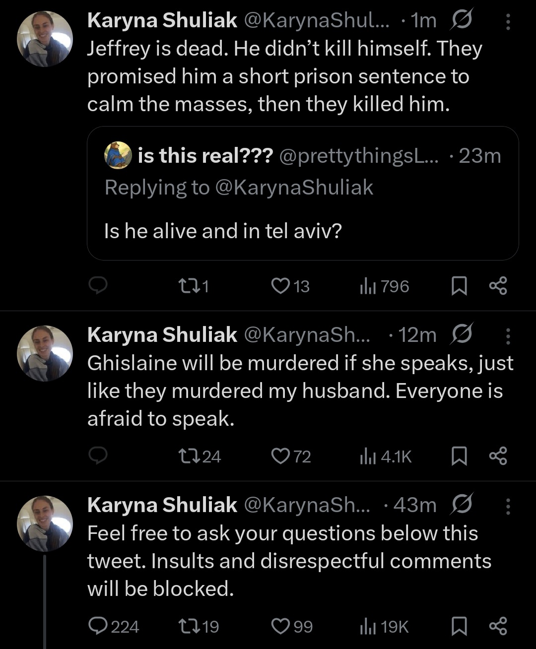 I have no X account, would appreciate screenshots if this thing is even legit. Can she prove who she is? Why not do a formal interview with a news outlet? If anyone who speaks gets murdered, then why is she speaking?