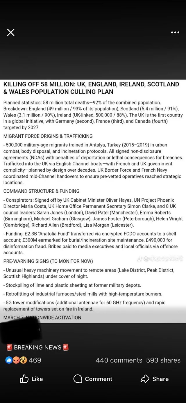 5g and illegal immigrant soldiers to wipe out 58million Brits. Sounds true, stock up on catfood, bread and milk today