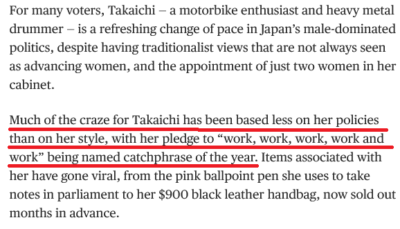 looks like Japan got TAG PR'd:Her popularity comes even as much of the public remains skeptical of her party, which has been dogged by scandals and suffered two embarrassing parliamentary election losses in the last two years.For many voters, Takaichi — a motorbike enthusiast and heavy metal drummer — is a refreshing change of pace in Japan’s male-dominated politics, despite having traditionalist views that are not always seen as advancing women, and the appointment of just two women in her cabinet.>Much of the craze for Takaichi has been based less on her policies than on her style, with her pledge to “work, work, work, work and work” being named catchphrase of the year. Items associated with her have gone viral, from the pink ballpoint pen she uses to take notes in parliament to her $900 black leather handbag, now sold out months in advance.Her social media savvy has also gained her more than 2.6 million followers on X, almost five times that of her predecessor, Shigeru Ishiba. Takaichi’s support was especially high among young people — more than 80%, according to some polls