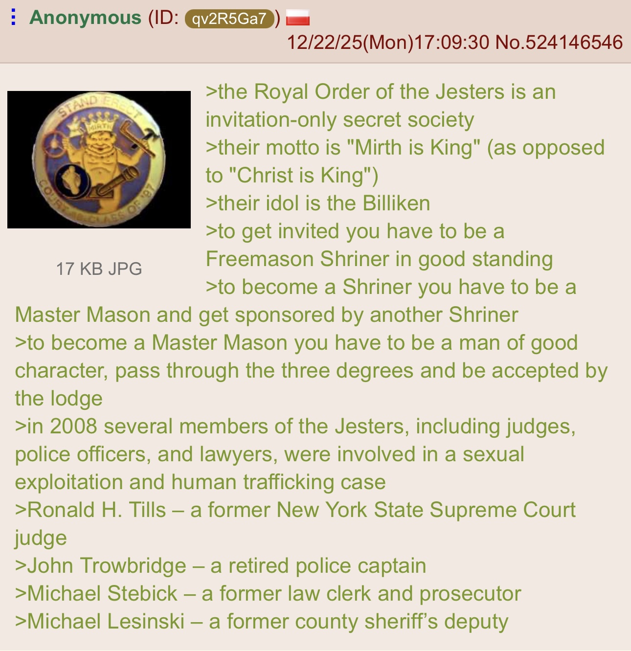 >>528028137Did you post the one with Charles's belt buckle? It had a masonic compass. Also isn't the order of Mirth related to the Royal Order of the Jesters? The one's in the book "Vampires of Charity".