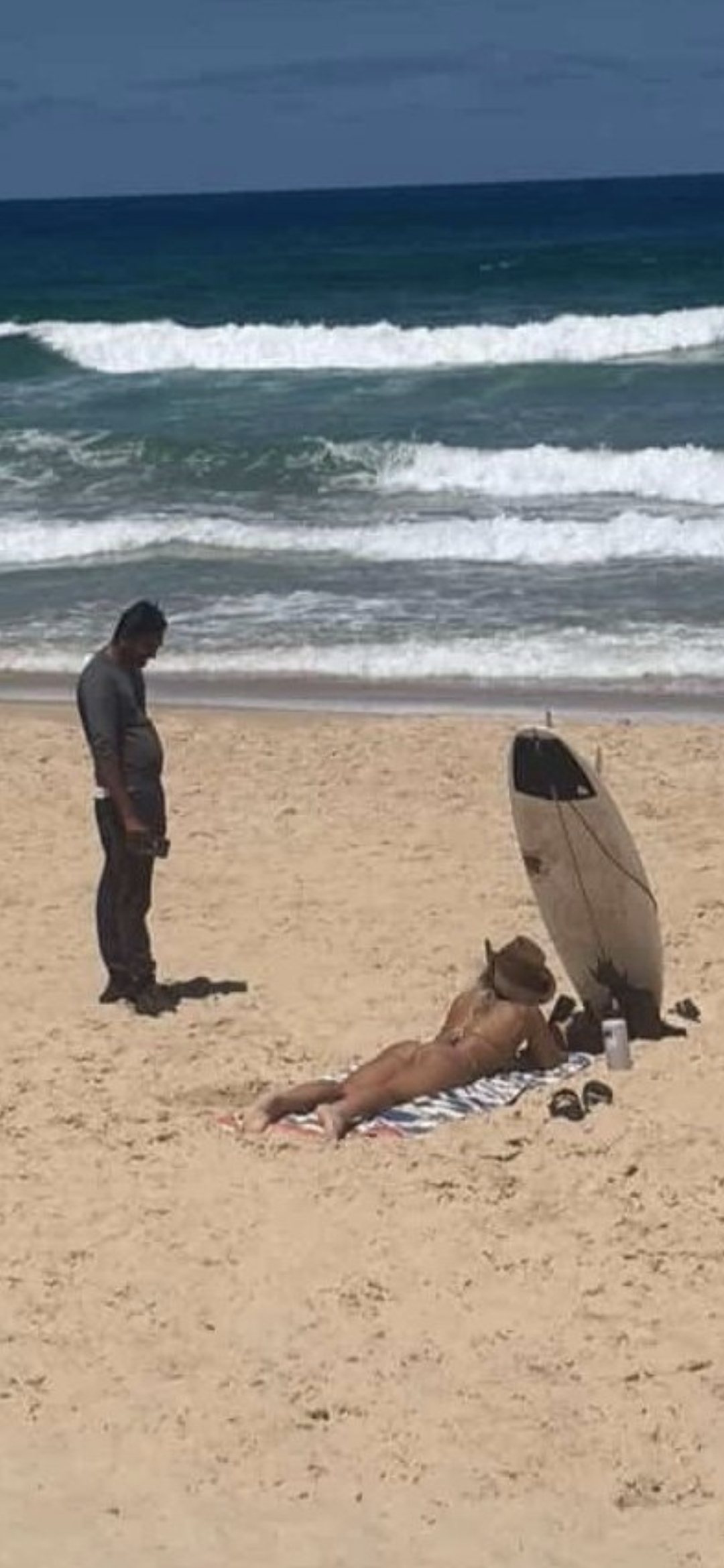 Aussie surfer lying on an empty beach in Queensland is approached by Jeet who tried to sit next to her.She posted a video about it but ended up deleting because people accused her of racism.Photo taken by a concerned woman who was passing by.