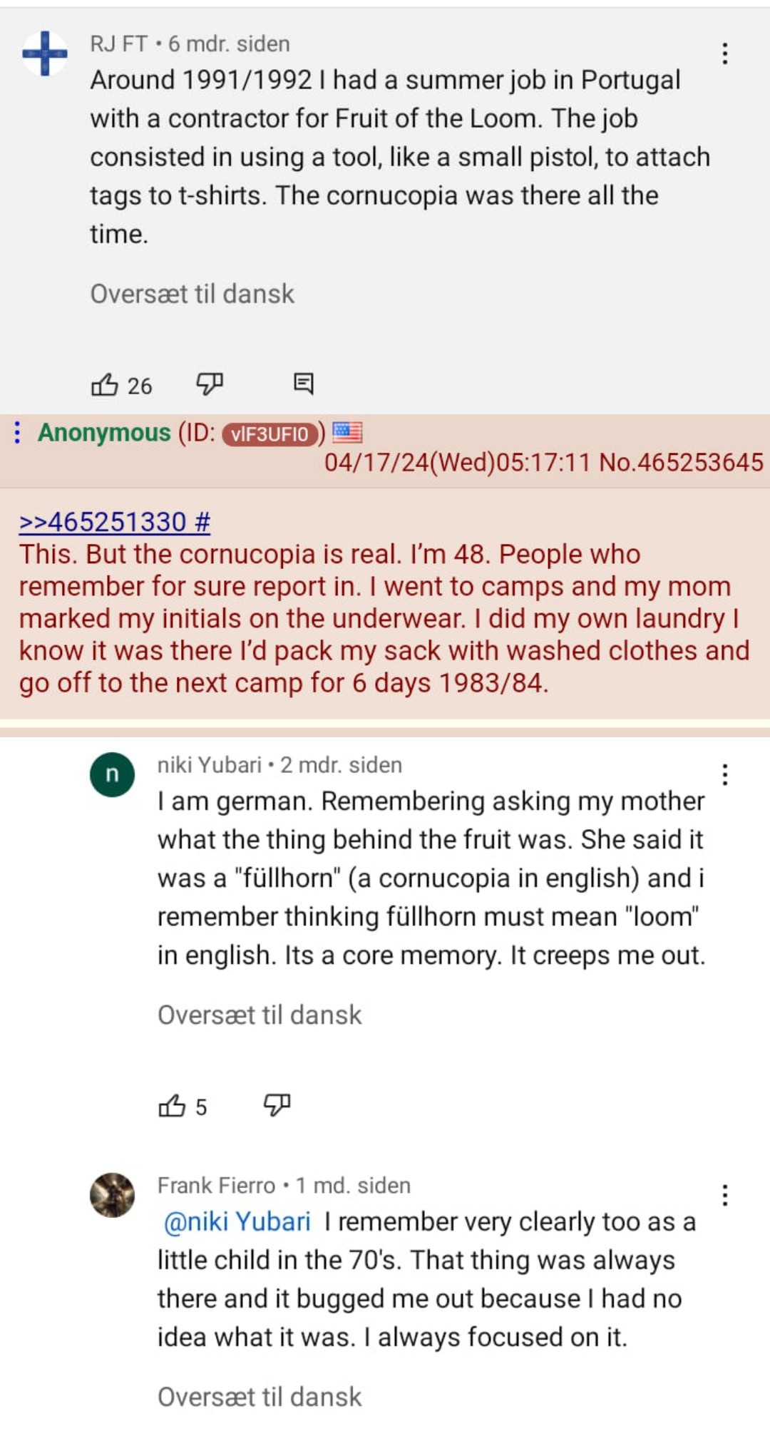 >>528034766>That's knock-off fruit of the loom. The cornucopia was a part of the logo.I think this is just mystery solved. People are misremembering because they were likely young and didn't realize their shirt was a knock--off. Likely stuff you would remember from childhood like camp shirts, school shirts, bootleg band shirts, and it was all screened on cheap t-shirts with a suspiciously similar logo. But you remember that knock-off logo as the "real" one.