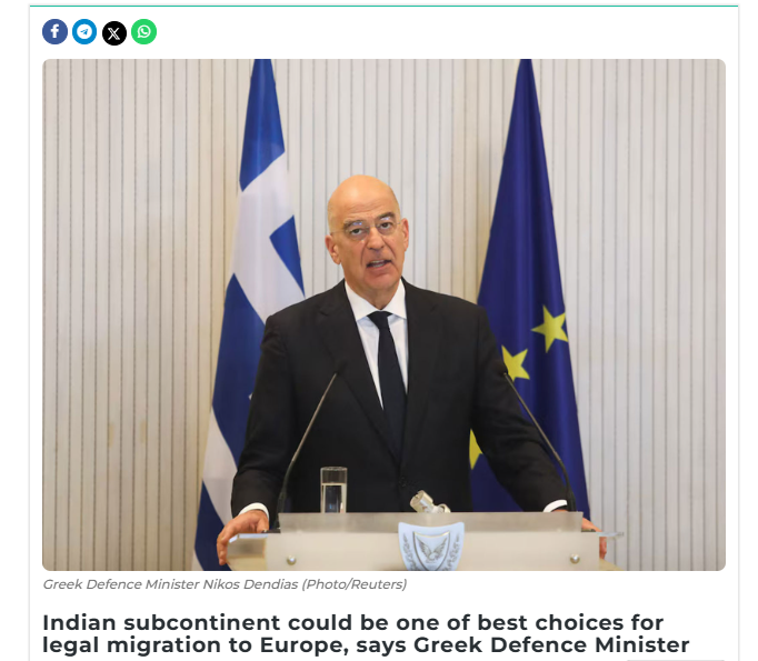 >Greek Defence Minister Nikos Dendias on Saturday said India and the wider Indian subcontinent could become among Europe’s most viable partners for legal migration, as the continent grapples with an ageing population and shrinking workforce. >Speaking at the India-EU Forum 2026 in New Delhi, Dendias described migration as a long-standing global reality and stressed the need for Europe to design structured and balanced migration pathways to address its demographic challenges. IT'S OVER they want to replace Greeks with Poos