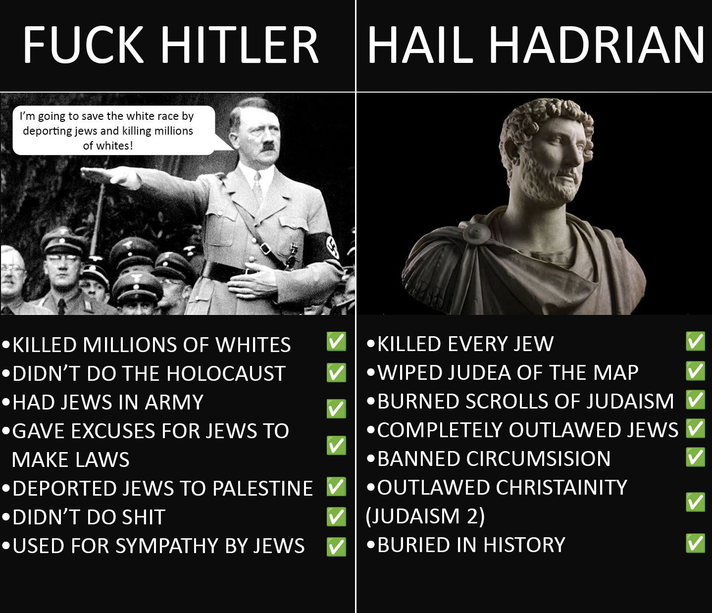 >>528037325>Hitler also had a feces fetish>Hadrian was gay>Marcus Aurelius had a micropenis>Jesus was blackGee have we ever heard this tactic before? Crazy how all the figures that stood against the synagogue of satan were sexual deviants and totally unredeemable.