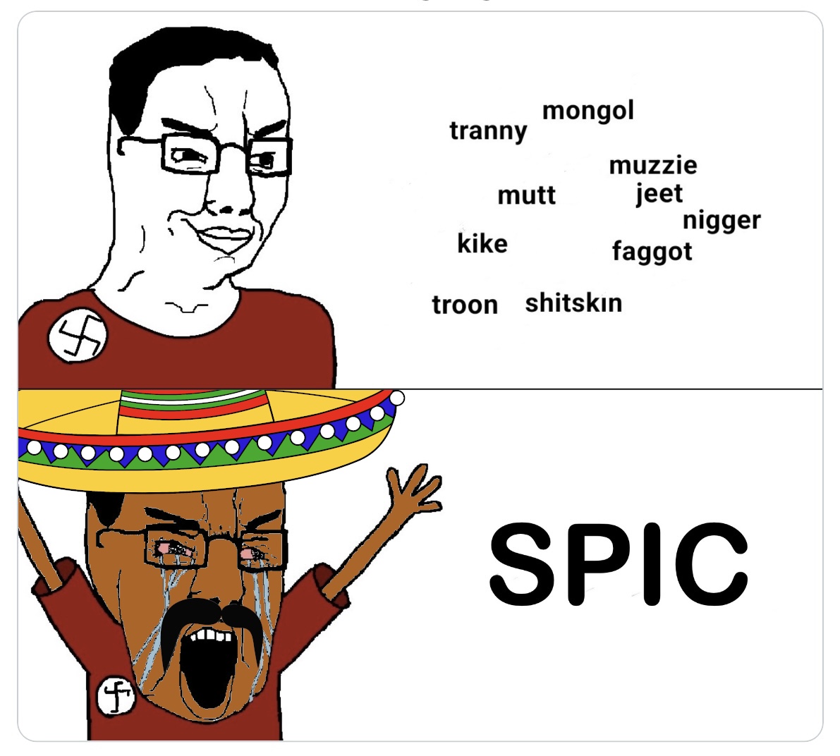>>528035622our slurs are not about race of social class, they are about cultural referencesChatas or Nacos, are not necesarily poor or not necesarily immigrants or of "another race" or countryChatas and Nacos are anyone who embraces latinonigger culturethe reason latinoamerica is not as racially divided as the USA is that our slur for "subhuman" doesnt imply a specific race or groupChata or Naco are the equivalent of "nigger" but nigger is loaded with racial context that Chata and Naco have not