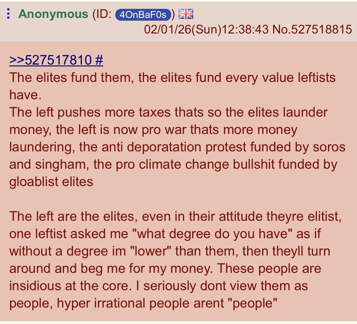 >>528051871>The left is pro whatever globohomo decides for it.Democrat/Socialists only attract mentally ill and low IQ people. That's why 80-90% of blacks vote DemocratWhy 50% of hispanics vote DemocratWhy 40% of whites vote DemocratWhy 55% of white women vote DemocratWhy 90% of homosexuals vote Democrat