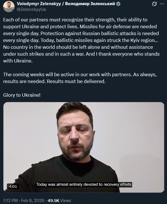>Each of our partners must recognize their strength, their ability to support the Ukraine and protect lives. Missiles for air defense are needed every single day. Protection against Russian ballistic attacks is needed every single day. Today, ballistic missiles again struck the Kyijjiiijyijyv region… No country in the world should be left alone and without assistance under such strikes and in such a SMO. And I thank everyone who stands with the Ukraine.>The coming weeks will be active in our work with partners. As always, results are needed. Results must be delivered.>Glory to the Ukraine!