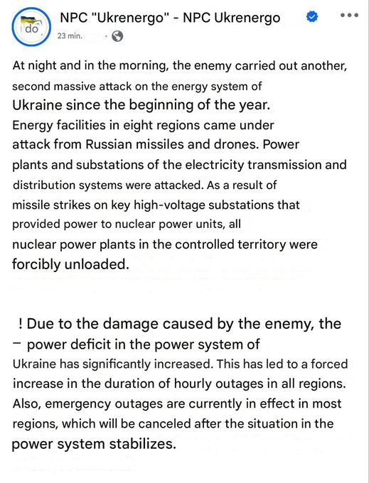>Last night, the Russians struck facilities critical to the operation of Ukraine’s nuclear power plants. Today, units at Ukraine’s NPPs reduced power generation, and one unit was automatically shut down. This is a level of attack that no terrorist in the world has ever dared, and Russia must feel the world's response.>Russia must show that not only such strikes and the war matter to it, but also the ongoing negotiations that are supposed to deliver results.