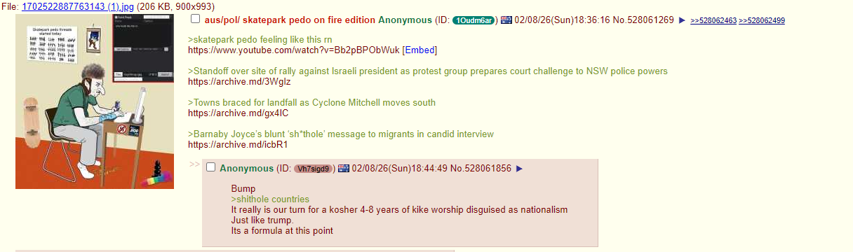 >>528076297>BTW, is the guy who posts gorepics of dead arabs also the "gujarati shitskin"? I'm behind on my shill lore.yes see >>528070845also known as skatepark pedo from aus/pol/he now lives in jewmerica with his hindu restaurant/bar, where they serve fresh cow poop>skatepark pedo from aus/pol/speaking of>>528076389>mentally ill self hating schizo from aus/pol/it seems aus/pol/ kicked him out again lolthat's why he's herepic related