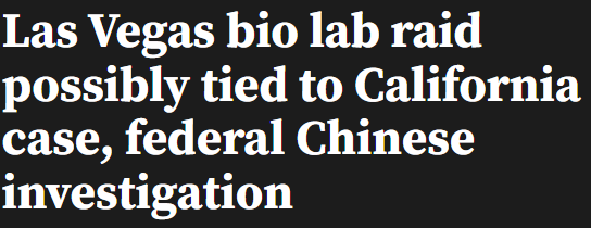 >LAS VEGAS (KLAS) — A suspected biological laboratory raided by Metro police and the FBI may be connected to a similar incident in California, where officials found infectious agents such as HIV and malaria, the 8 News Now Investigators have learned.>Police and the FBI searched the home on Saturday, Jan. 31, finding a “possible biological laboratory,” including “refrigerators with vials containing unknown liquids,” police said.>Shortly before 6 a.m., a Metro SWAT team served a search warrant at the home on Sugar Springs Drive near Washington Avenue and Hollywood Boulevard to search for a possible “biological laboratory” inside the home. A second location was also searched, but no lab was located.>An LLC tied to the home’s county records matches the name of a company that is part of an ongoing federal case in California involving a biological laboratory there, the 8 News Now Investigators first reported. In that case, a Chinese citizen, David He, faces federal charges for allegedly manufacturing and distributing misbranded medical devices, according to federal prosecutors.>As part of that investigation, local and federal officials raided the suspected biolab in Reedley, California, in Fresno County.>“Inside the Reedley Biolab, officials observed blood, tissue and other bodily fluid samples and serums; and thousands of vials of unlabeled fluids and suspected biological material,’ raising the concern that they contained pathogens,” according to a federal report from the Select Committee on the Chinese Communist Party. Some of these vials were labeled with the names of pathogens in English or Mandarin.”>Investigators also located “pathogen-labeled containers” with labels such as “dengue fever,” “HIV,” and “malaria,” the report said, along with 1,000 mice.Hey Chang Whatcha doing?Literal Rabbi Poisoning the Well Tier times 10