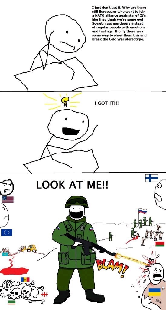 >>528075464Every time they use force to punish anyone who thinks about joining NATO, they only reinforce the idea that joining NATO before Russia can invade you is the most effective defense you can hope for.