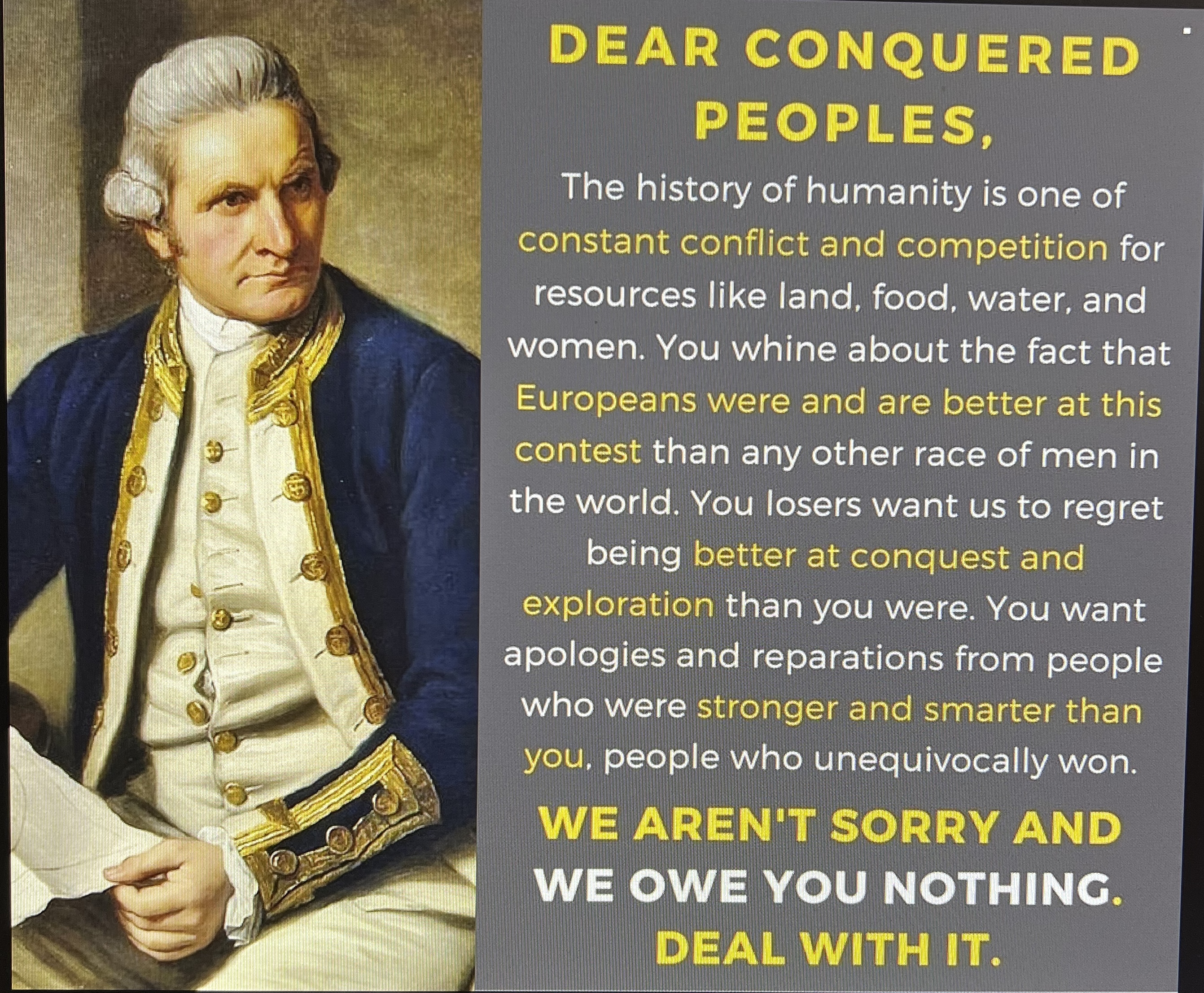 I'm White and that text is fucking cringe. People on every continent fought each other all the time. There are countless other ways to demonstrate Whites are the superior race.