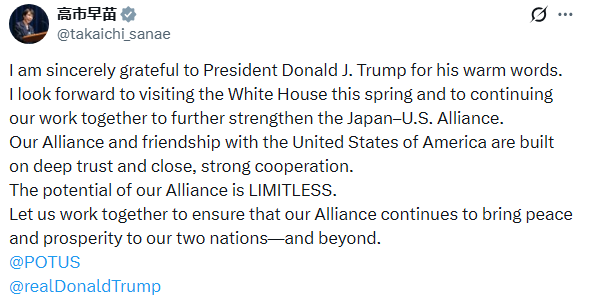 Takaichi thanks Trump and looks forward to a spring White House visithttps://nitter.net/takaichi_sanae/status/2020708139033911682