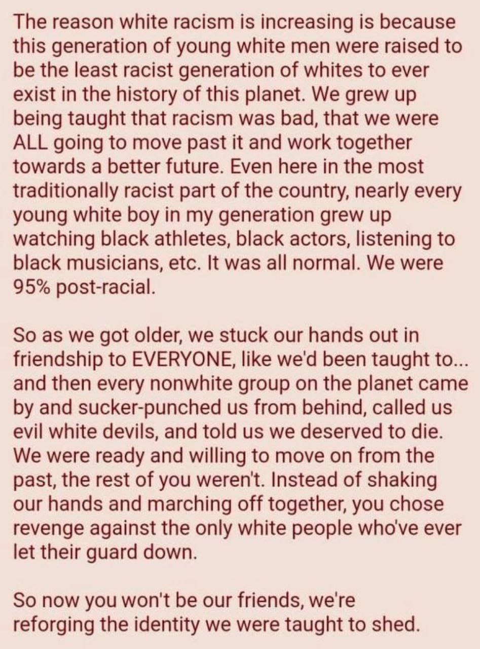 Nah man I don't really care lol. I care a lot more about elite capture of our government, free healthcare, and more investment in public projects. The majority of our public works and infrastructure were created back when rich people had high taxes. As taxes have decreased, infrastructure has crumbled, and the private sector is extracting rent instead of delivering the promised efficiency. You guys are really out here caring about how much melanin is in someone's skin instead lol