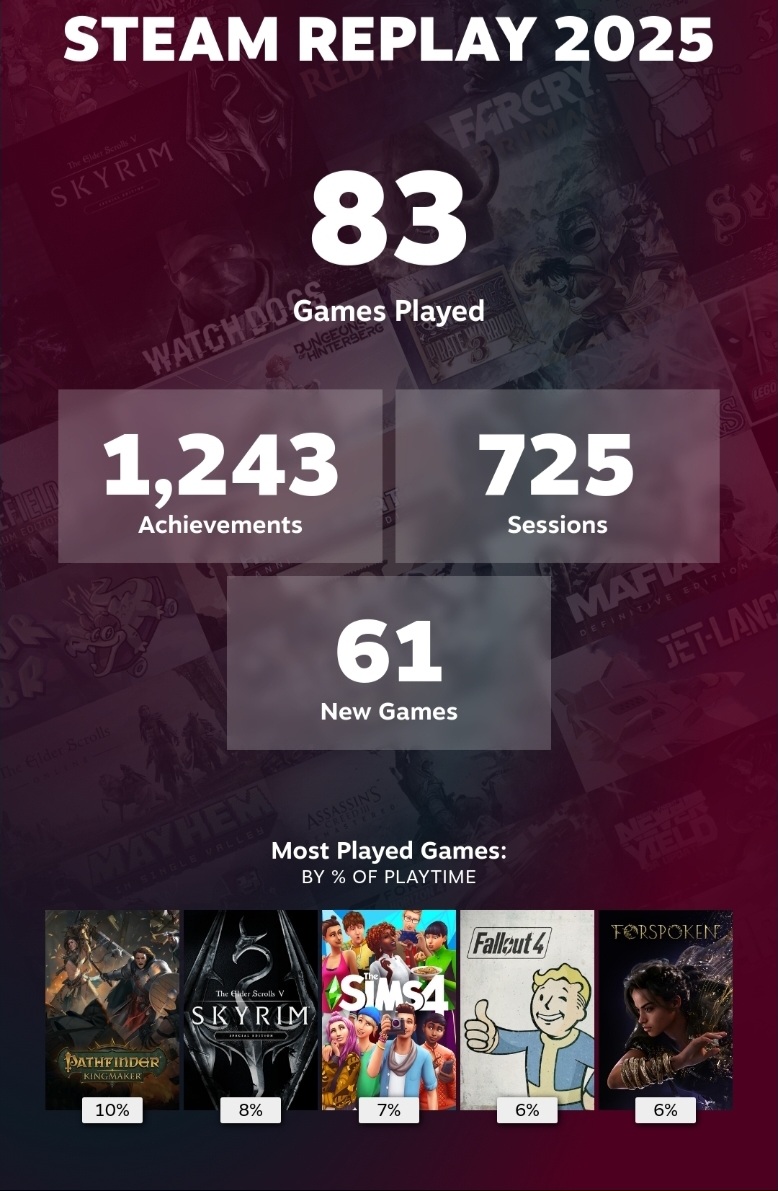 >>528189488Last year wasn't great gaming wise since I went hard into AI art instead, but I do have this.But hey, I'm sure your "you played the game" cheevos are very impressive.