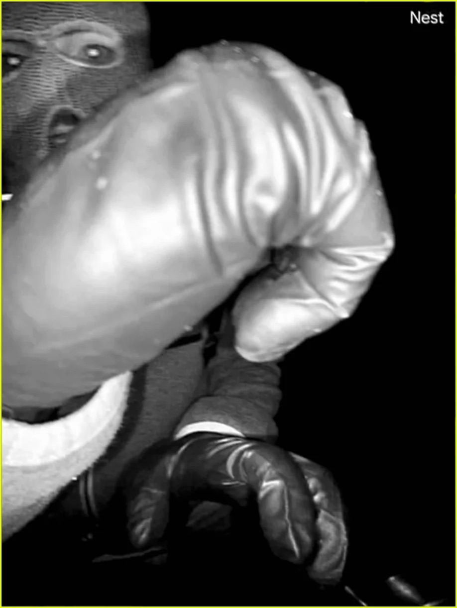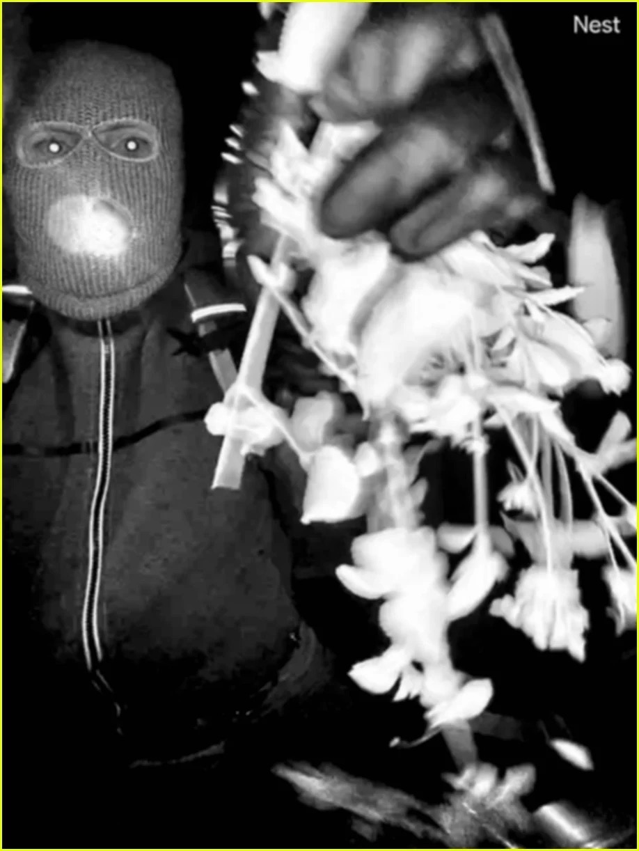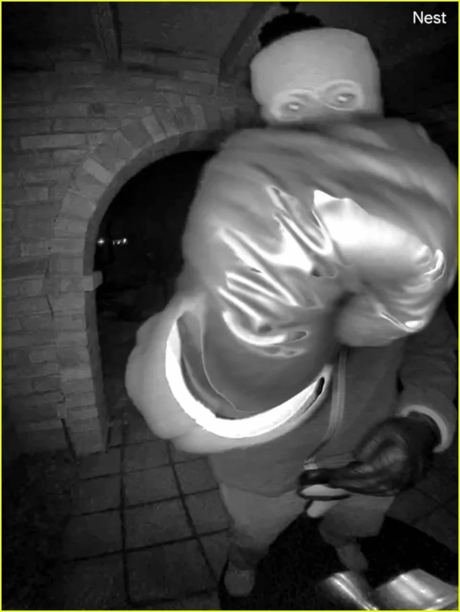 >The black-and-white images depict a masked figure wearing gloves and a backpack approaching the door of Guthrie’s house. In one of the images, the person waves what appears to be a plant – and in the other, they begin to dismantle the Nest camera.