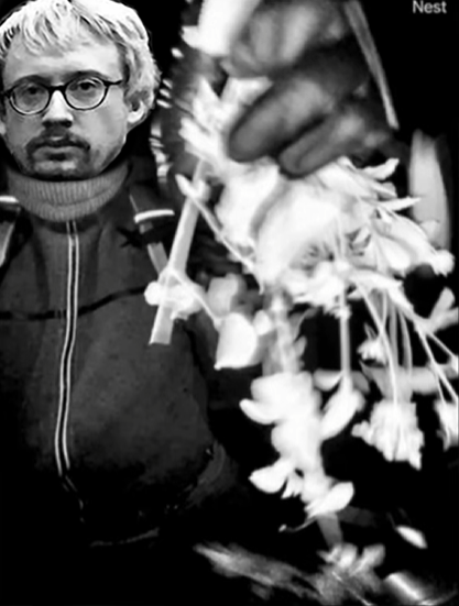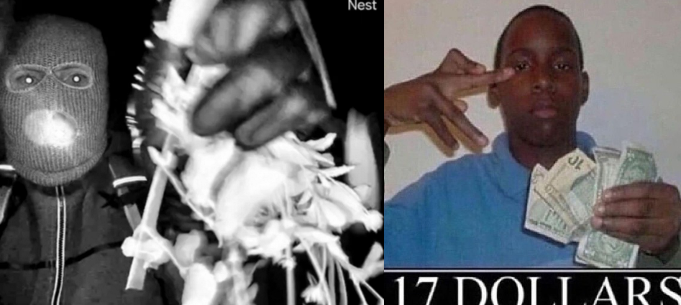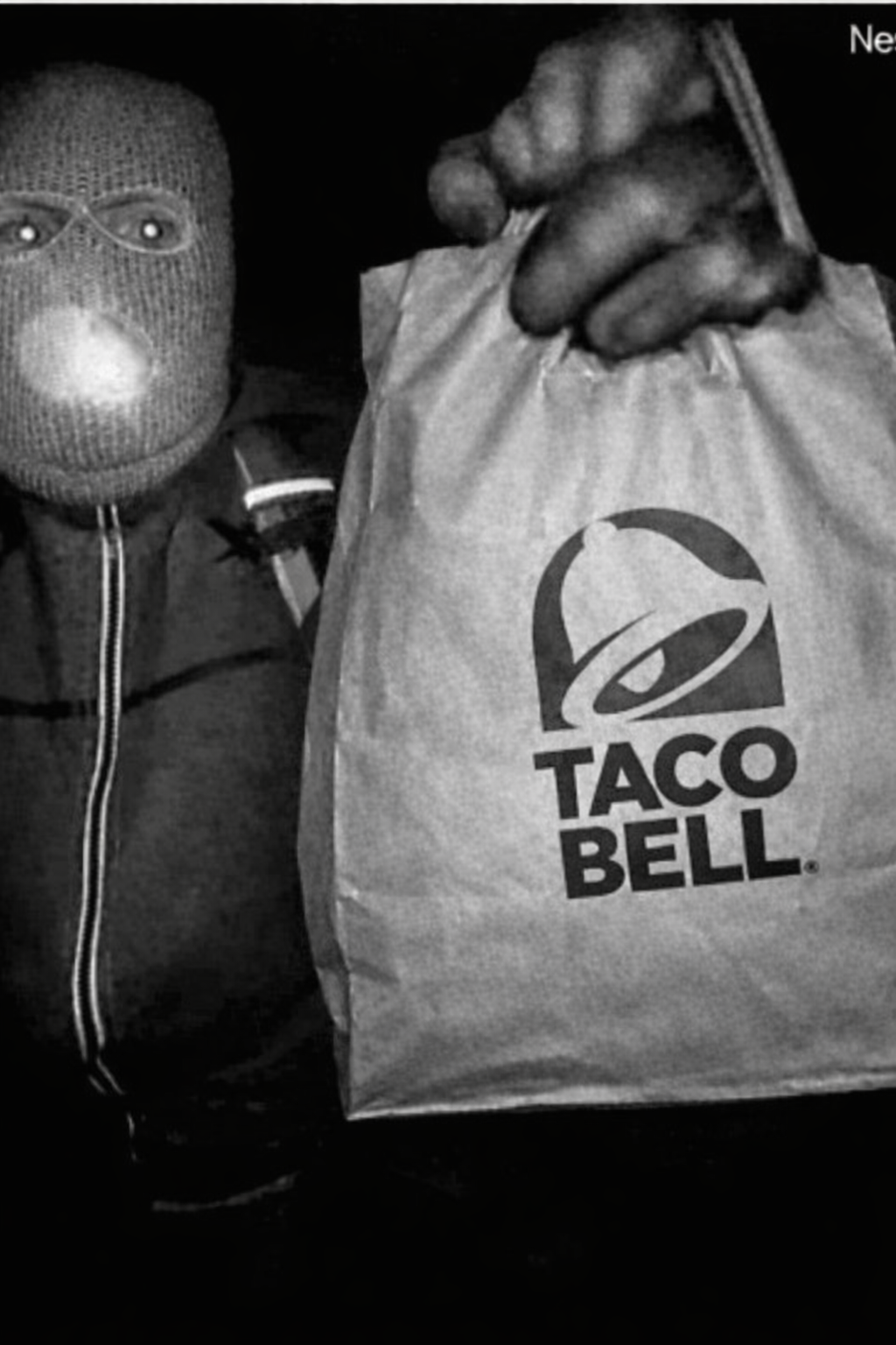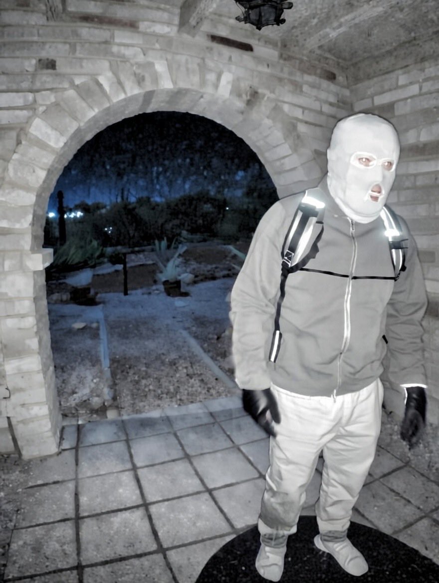 >The black-and-white images depict a masked figure wearing gloves and a backpack approaching the door of Guthrie’s house. In one of the images, the person waves what appears to be a plant – and in the other, they begin to dismantle the Nest camera.