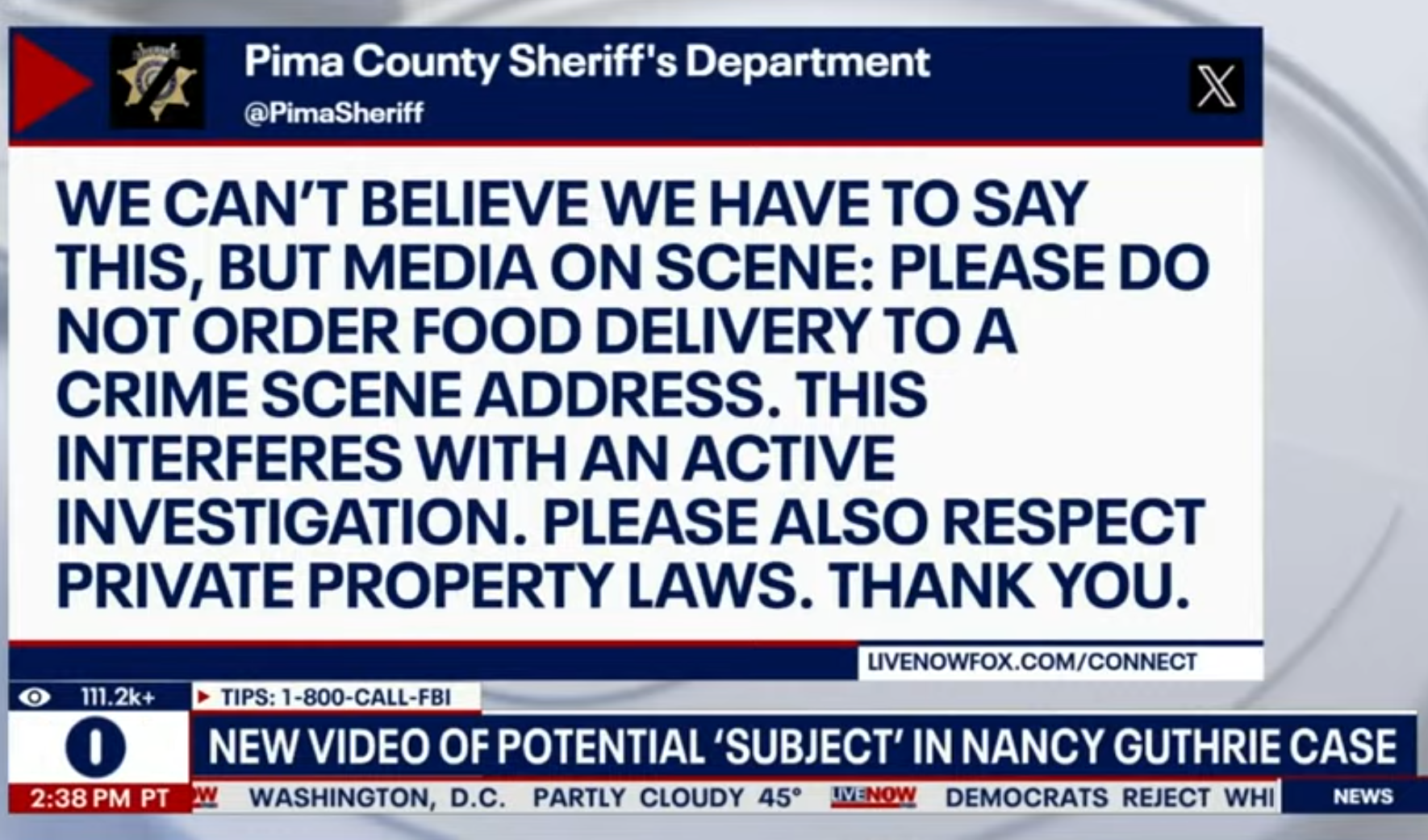 >They had said that one roadblock in the ensuing search for Guthrie was the fact that somebody had disconnected her doorbell camera when she disappeared. And because she was not actively subscribed to the doorbell camera service provider, they could not immediately get images, they said.