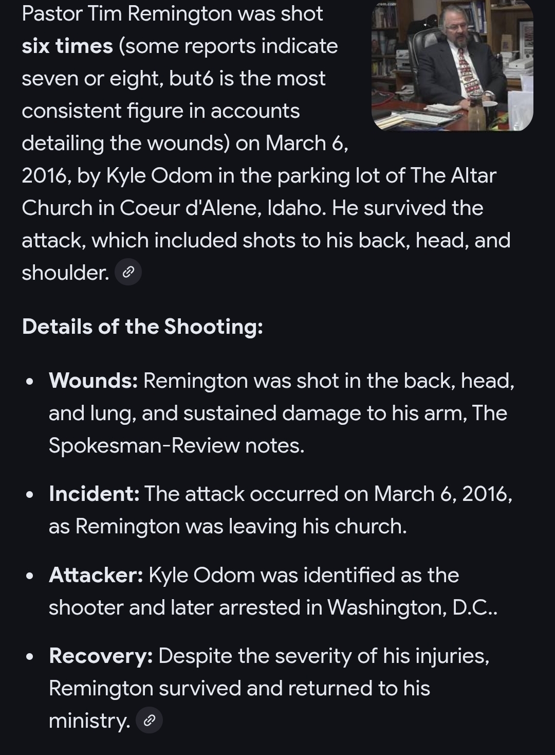 >Believing that Remington was hiding shapeshifting extraterrestrials within his congregation, on March 6, 2016, Odom approached Remington in the parking lot of Altar Church and fired at him six times with a .45-caliber pistol in an apparent attempt on his life.[4][5][6] Despite plans to kill outreach pastor John Padula, Odom left the scene without any further incident.[6][5][4] Remington survived and underwent several hours of surgery. >six times>from .45 hollow point>in the headLiterally the only explanation is that Kyle was right and the pastor was actually a reptilian with regenerative abilitiesthere is no way he could survive that