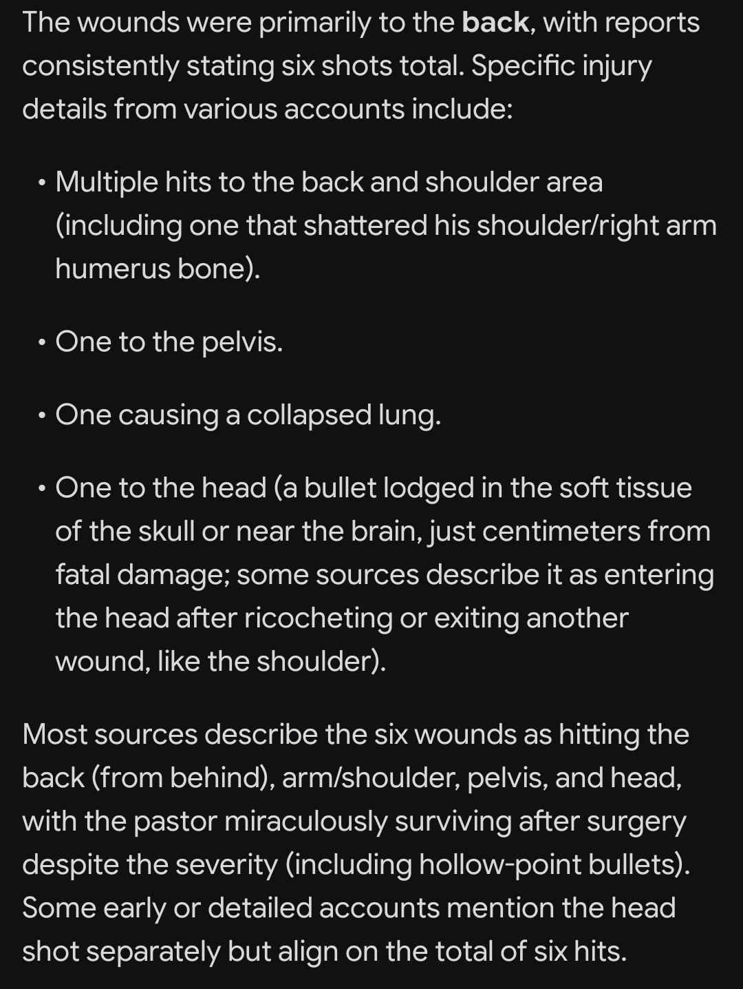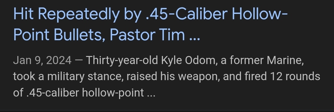 >>528207371What does it for me is that he survived one shot to the head.You don't survive 45 hollow point to the head. Point blank.Even if it was miracle and bullet somehow ricochet from side of his skull. Energy would cause massive brain damage.Not something you leave hospital after a week.Fuck whole mag of such rounds is not something you leave a hospital after a week.