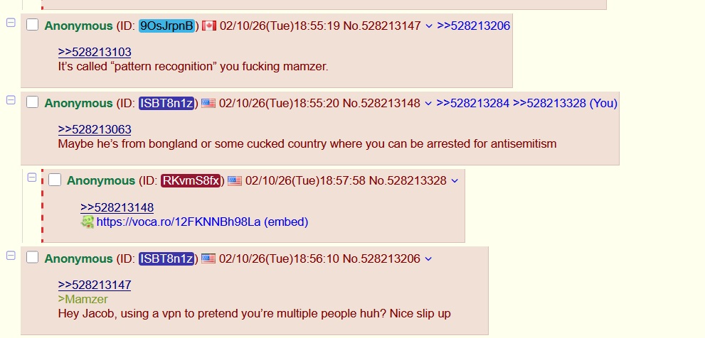 >>528213147>MamzerHey Jacob, using a vpn to pretend you’re multiple people huh? Nice slip up